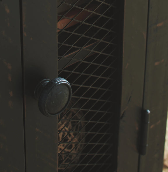 - Two-tone distressed finish (light brown top and rustic vintage black base)
