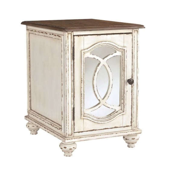 Elevating the art of traditional cottage styling, the Realyn chairside end table is sure to serve you beautifully for years to come. Antiqued two-tone aesthetic blends a chipped white with a distressed wood finished top for added charm. Cabinet door features inset mirror with filigree moulding for a fanciful twist.