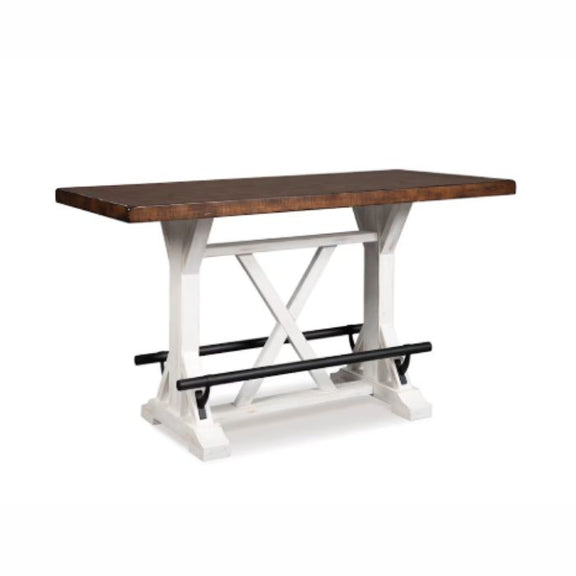 A high-style choice for smaller spaces, the Valebeck counter height dining table serves up the best in rustic farmhouse living. Its two-tone finish pairs a brown tabletop with a distressed vintage white base for a double helping of charm. Black metal foot rests add such a distinctive twist.A touch of rustic-industrial style is such a fashion-forward choice, and this barstool doesn’t disappoint. Making this set a beautiful centerpiece to your dining space or lounge.