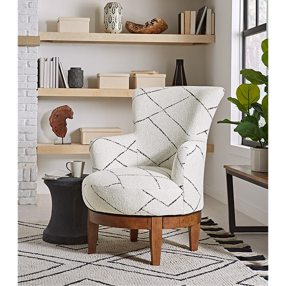 This regal 360-degree swivel chair will command the attention of any room. With a high back and flared ends, this chair evokes a prestigious air that cannot be ignored. The circular cushion is set atop a solid wooden base and legs available in three finish choices, and the covering comes in hundreds of options, from a stylish patterned fabric to colorful solid.