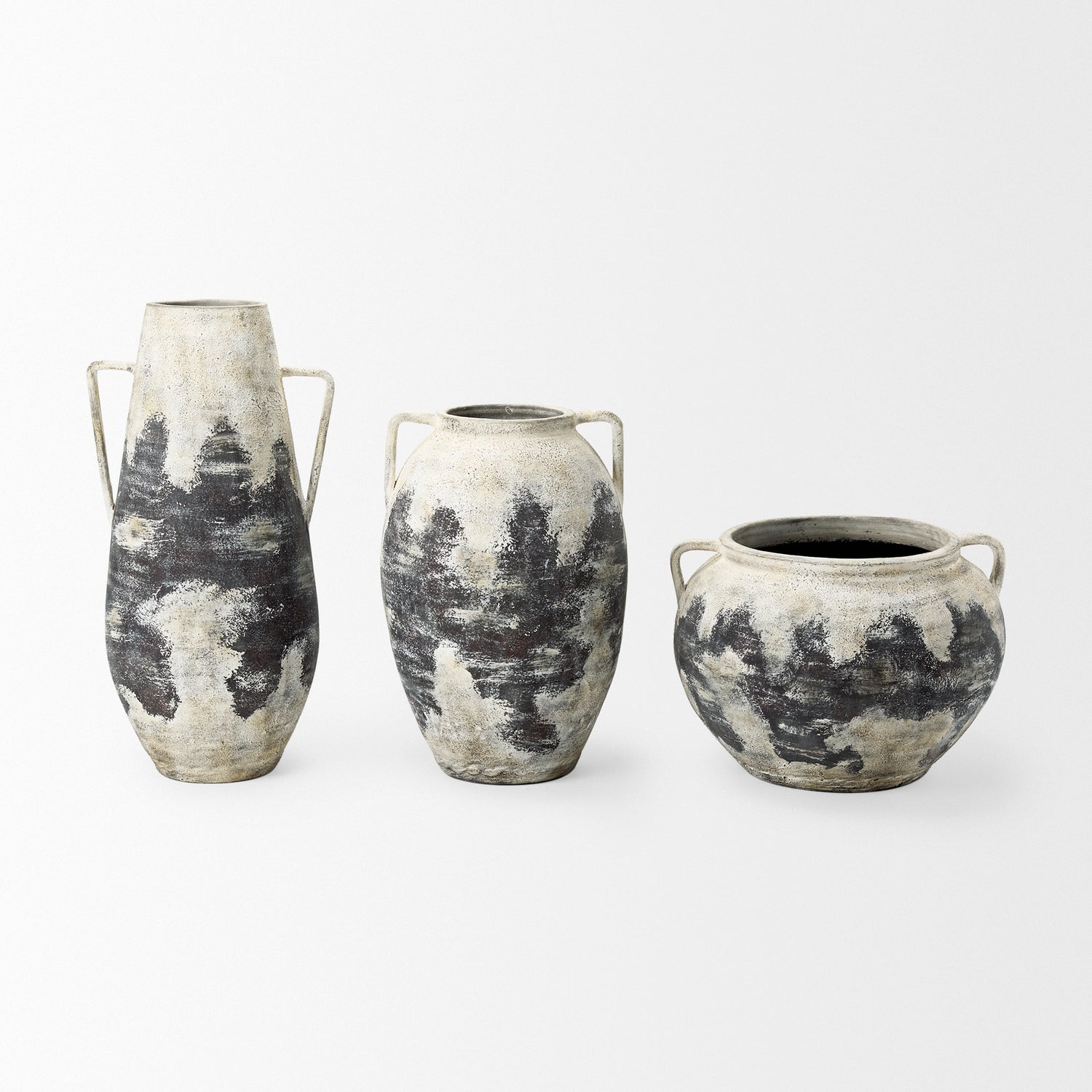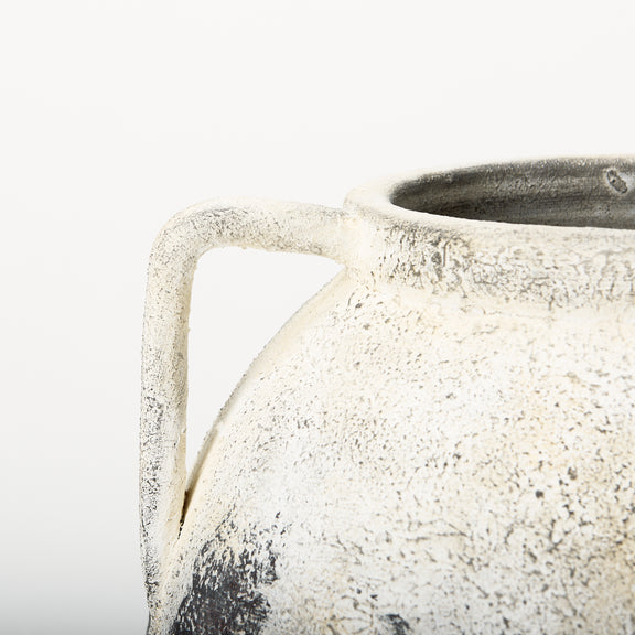 A beautiful, textured floor vase with contrasting antiqued black and off-white finishes. It can be used as a stand-alone piece or paired with the other Boscia Floor Vases to bring balance and texture.