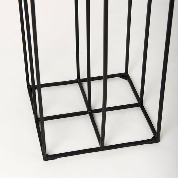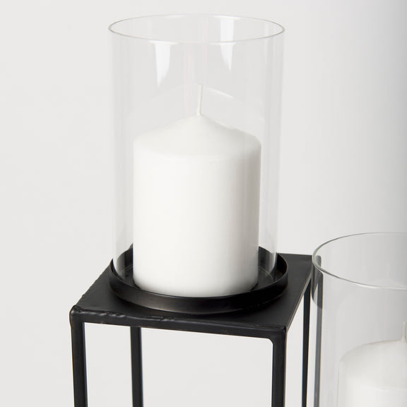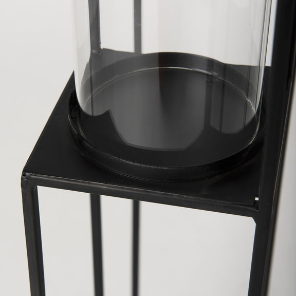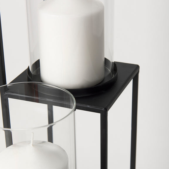 This Cindy Floor Lantern is a 4-tier, matte black metal pillar candle holder with cylindrical hurricane glass sleeves.