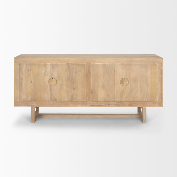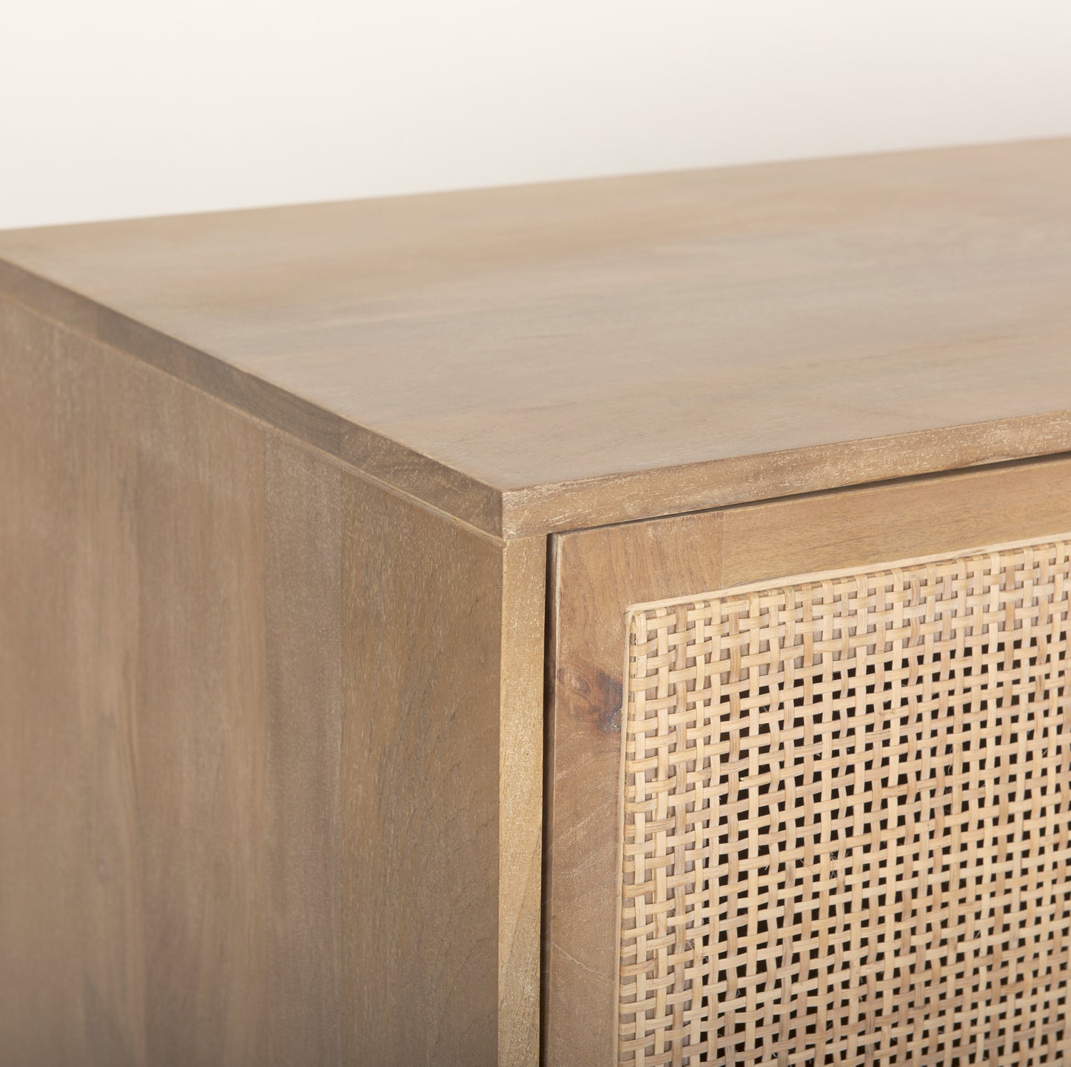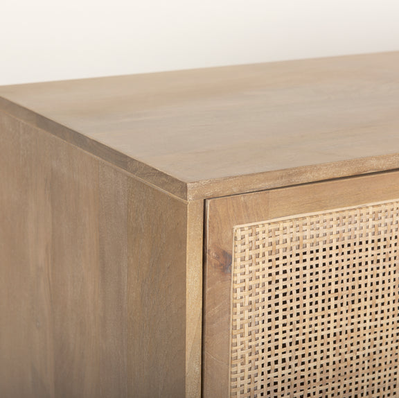 The Grier Sideboard is a light brown mango wood and finished with four cabinet doors that feature a cane lattice door front.