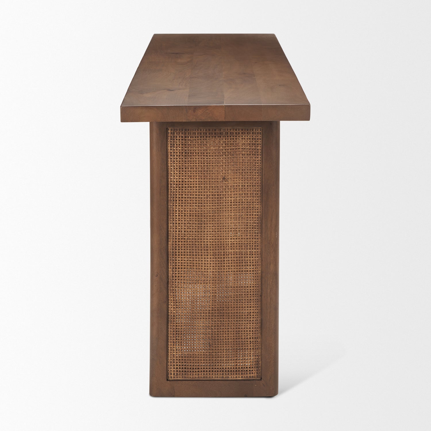 The Grier Console Table is made of solid, medium brown mango wood with two cane panels that can be seen on the sides of the table.