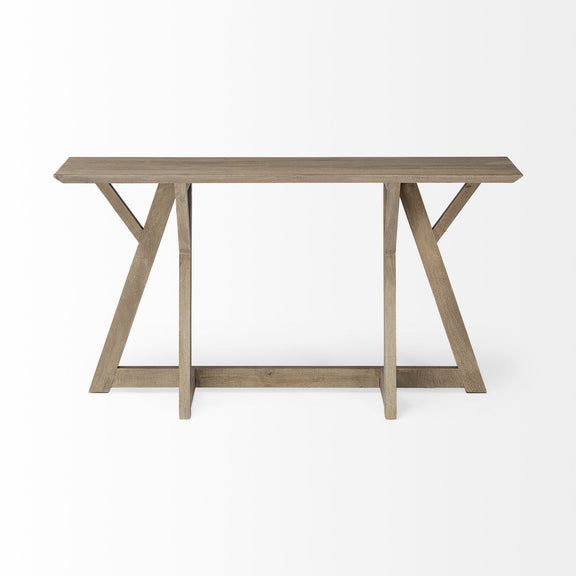 The Jennings I is a stunning, wooden console table stabilized by a geometrically appealing wooden frame and base.