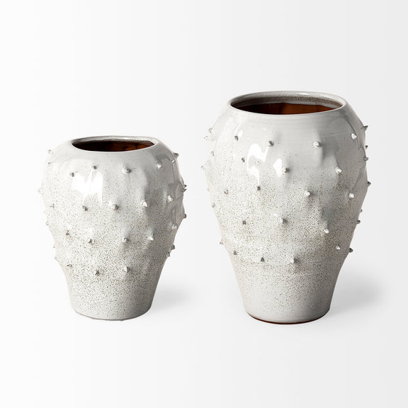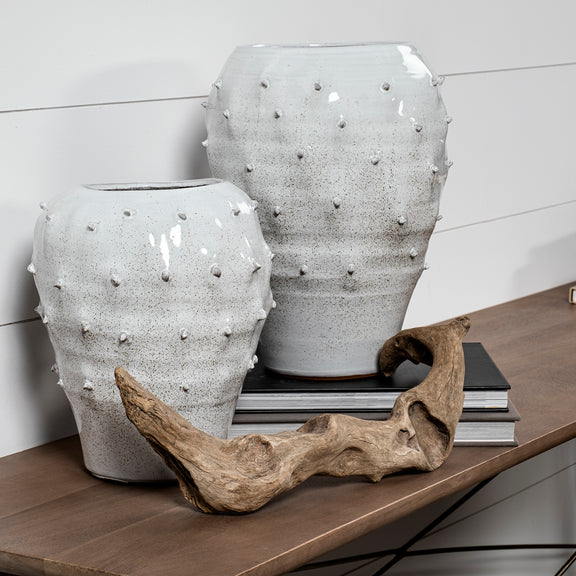 The Julian series comprises of ceramic vases finished in a glossy white tone with spokes on the exterior.