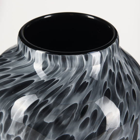 The Masai Glass Vase medium is thick, black polished glass with a mottled, milky haze overlay.