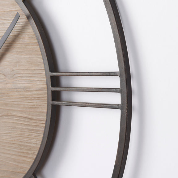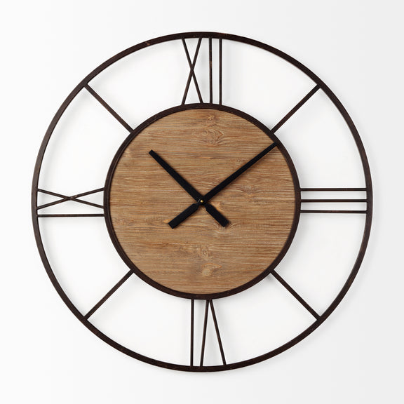 This classic style wall clock features an open design with large, cut-out Roman Numerals encircled by a solid iron frame. The Roman Numerals are constructed from iron, and the center dial contrasts with wood.
