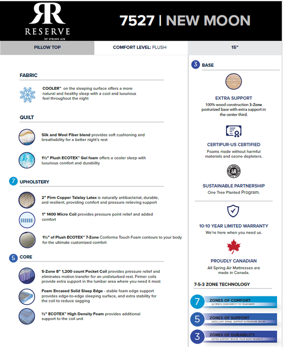 The New Moon Plush mattress by Spring Air is a 15" European pillow top mattress designed for those who crave plush comfort with a touch of elegance. Enhanced with COOLER™ technology, it offers a natural and healthy sleep with a cool feel throughout the night. The mattress features zones of comfort, support, and durability, along with 2,600 pocket coils for custom support. Made in Canada and backed by a 10-year limited warranty, the New Moon Plush is a dream come true.