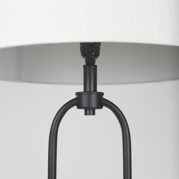 The Sarah Floor Lamp features a black arched metal frame coupled with a white marble disc and a textured white shade.