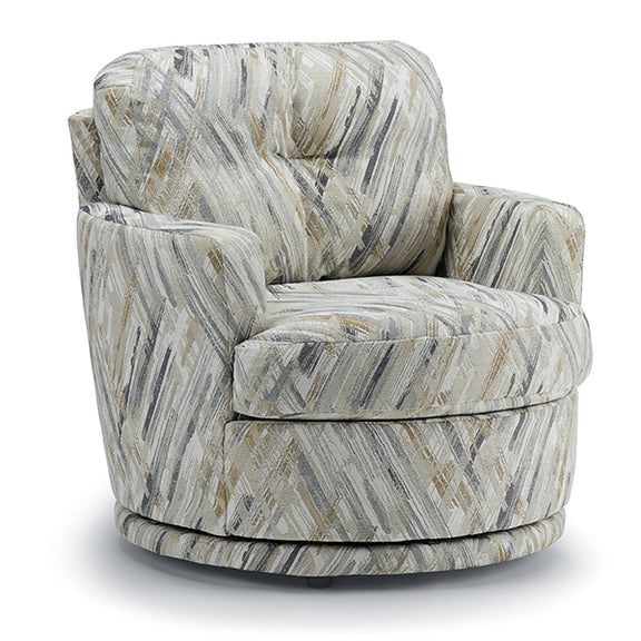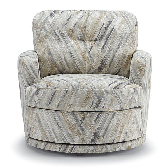 Bring your day full circle and take a rest in the Best Home Furnishings Skipper swivel chair. The circular base offers a funky, yet functional design that is sure to stand out (and do a full swivel turn) in any room. With over 700 fabric covering options, you can turn the Skipper into an even bolder statement piece or play up its shape with a more neutral hue. The swivel base comes upholstered, or you have the option of a wooden base in 3 finish choices: Dark Walnut, Espresso, and Riverloom.
