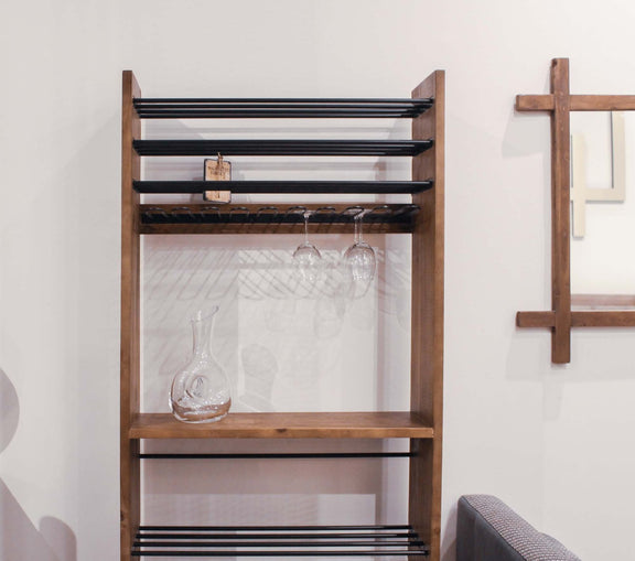 | Additional Dimensions | Space between metal racks: 3.5″ Shelf to bottom of glass holder: 20.5″ Middle rack to bottom of Wood Shelf: 11.25″ Weight capacity per shelf: 19.8 lbs |